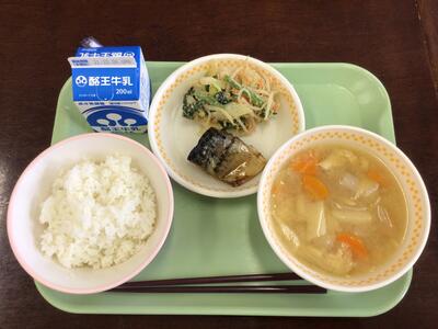 9月28日(火)の給食は、「和食の日」こんだてで、ごはん、玉ねぎのみそ汁、さばのおかか煮、ごまあえ、牛乳でした。