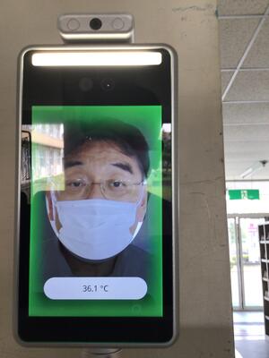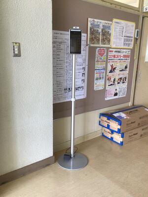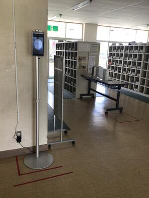 9月3日にアポロガスグループ様から寄贈いただいた、スマホ型体温計2台が納品され、早速玄関、昇降口に設置しました。これから生徒、職員、来校者の体調管理、健康意識の向上にさらに役立ててまいります。ありがとうございました。