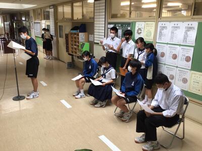 9月3日(金)午後、第40期生徒会本部役員選挙ならびに投票が行われました。放送により、それぞれの候補者と責任者が演説しました。後に体育館で投票がありました。より良い清水中にしていくために、みんなで考えていきましょう。