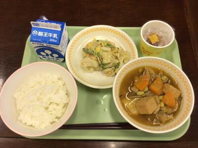 9月6日(月)の給食は、「減塩の日」こんだてで、ごはん、じゃがいものうま煮、アスパラのごまサラダ、納豆、牛乳でした。