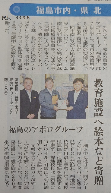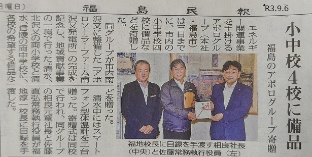 先日紹介した、アポログループ様からの寄贈の記事が、民報、民友に掲載されました。
