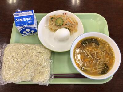 7月14日(水)の給食は、中華めん、ジャジャ麺かけ汁、 きゅうりと中華くらげのサラダ、 味付けゆでたまご、牛乳でした。