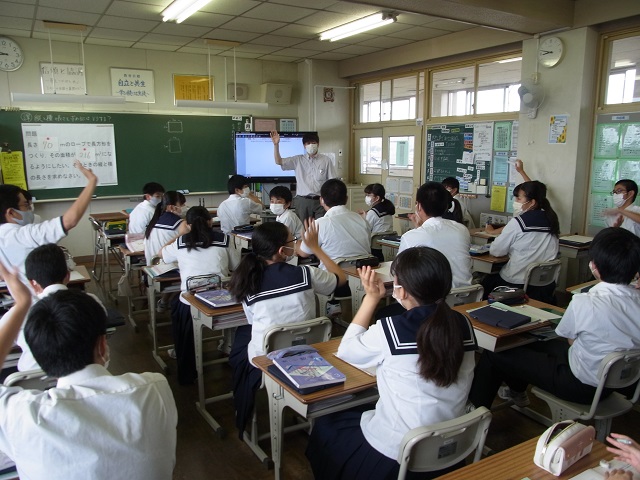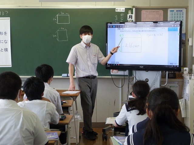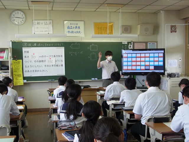 7月14日(水)、タブレットPCを活用した研究授業が行われました。3年数学「2次方程式」の最初の授業で、長さが決まっている一本のロープで四角形を作り、その面積が決められた数になるために縦横の長さを何mにすれば良いかという問いを探究するものでした。いろいろな考え方を3つのタイプに振り分けながら、各々がMetaMojiClassroomで書き込み、全員でモニターを見ながら課題解決していく流れで、生徒の皆さんは大変意欲的に取り組んでいました。