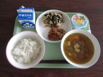7月15日(木)の給食は、ご飯、リザーブデザート 、冬瓜のスープ、海藻サラダ、豚肉の焼肉ソースがけ、牛乳でした。