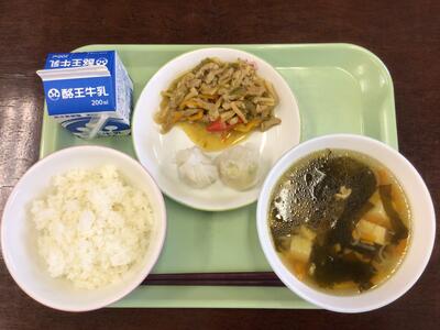 7月19日(月)の給食は、ご飯、わかめスープ、チンジャオロース、えび水晶包み、牛乳でした。