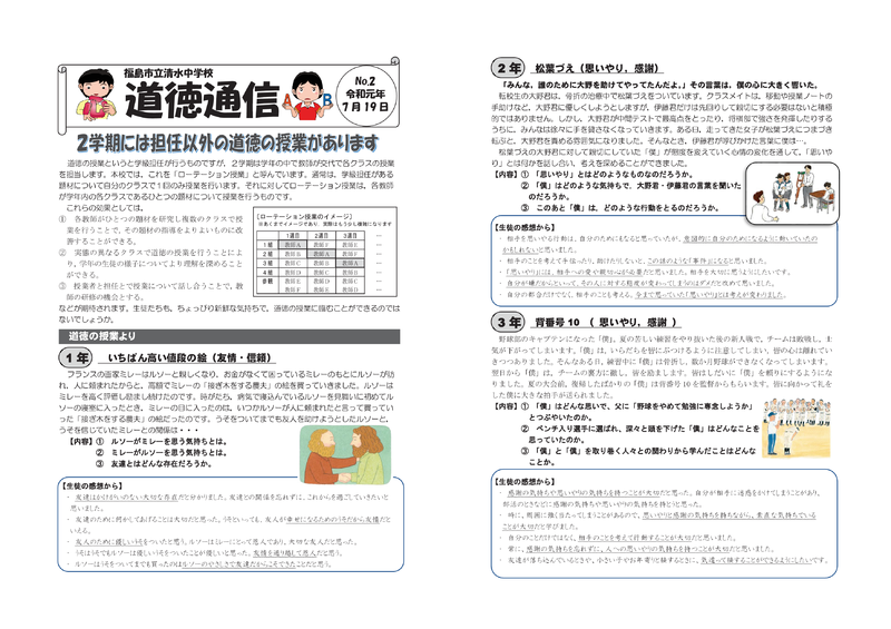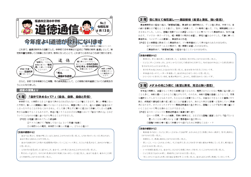 そのために大切なことを二つお話しします。一つは,全員が会員になっている生徒会が,その役割をしっかりと果たすことです。良い校風,充実した学校生活づくりのため,失敗を恐れず,努力を惜しまず,新たな挑戦をしてほしいと願います。特に3年生は下級生に何を残していくのか,逆に1,2年生は何を引継ぎより良い清水中を創造していくのかをしっかりと考え,実行してほしいと思います。