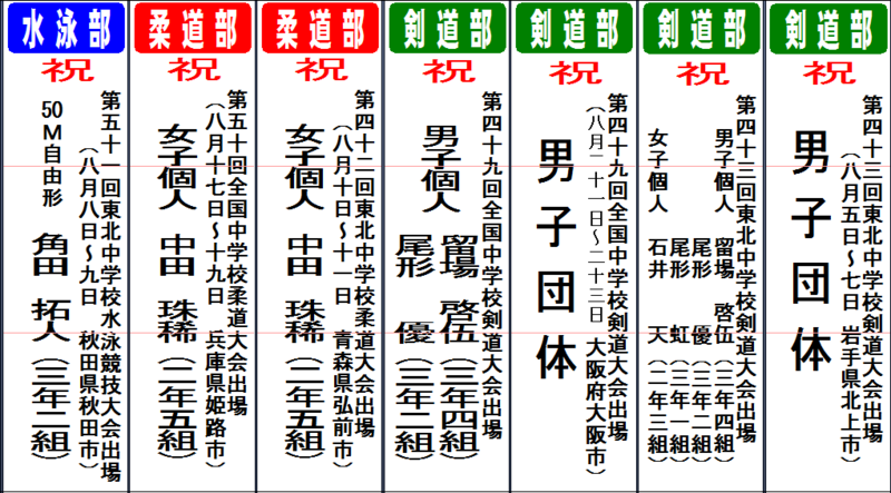 7月の中体連福島県大会を勝ち抜き、見事東北大会、全国大会への出場権を獲得した剣道部、柔道部、水泳部へのお祝いと激励をかねた垂れ幕を、昇降口に掲示しました。上位大会での活躍を全校あげて応援したいと思います。