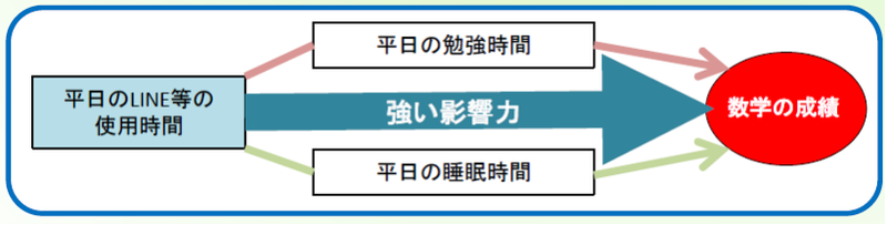 上のグラフは,仙台市標準学力検査の中学生の数学の平均点と平日一日あたりの通信アプリの使用時間との関係について示したものです。「平日に30分未満しか勉強しない(◆の折れ線)」生徒の状況を見てください。通信アプリを使わない(スマホや携帯を持っていない)生徒の数学の平均点は,約61点でした。しかし,3時間以上使う生徒の数学の平均点は50点以下に急激に低下しています。この群(◆の折れ線)の生徒は,家庭ではほとんど勉強をしていません。つまり,「通信アプリの使用時間が長くなるほど生徒たちの中から,学校で習得した学習内容が消えて無くなった」ことを意味していると考えられます。また,右下がりのグラフから「スマホを長時間利用するといくら勉強しても成績が下がる」ということも分かります。下の図に示したように,平日一日あたりの通信アプリの使用時間の長さは,勉強時間や睡眠時間を介した影響力よりも圧倒的に強く,直接的に成績を下げる方向に作用している恐れがあることが分かりました。これは分析を行った研究チームとしても,非常に衝撃的な結果でした。なぜなら,「通信アプリの使用によって勉強時間や睡眠時間が少なくなるから成績が落ちる」わけではなさそうだからです。