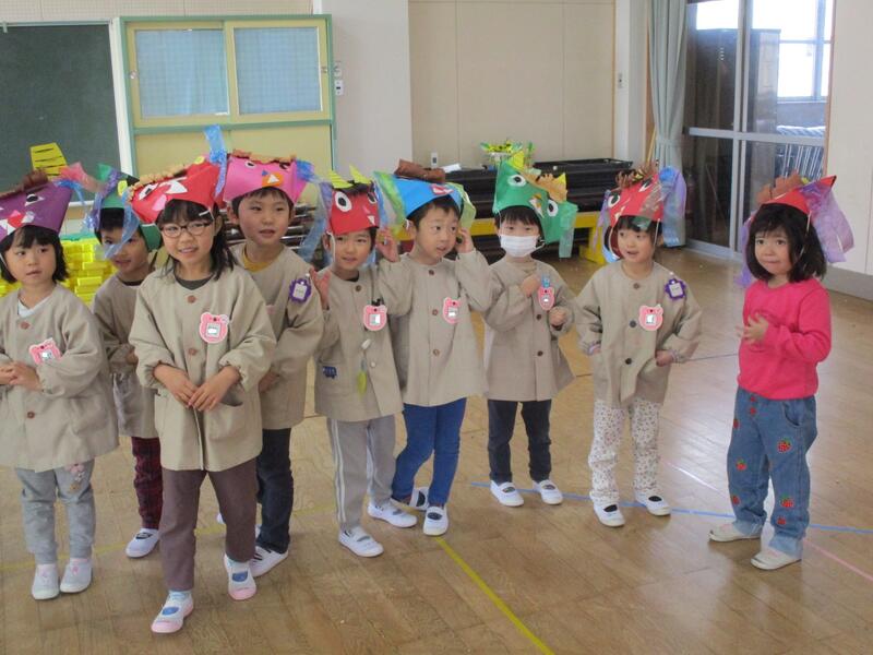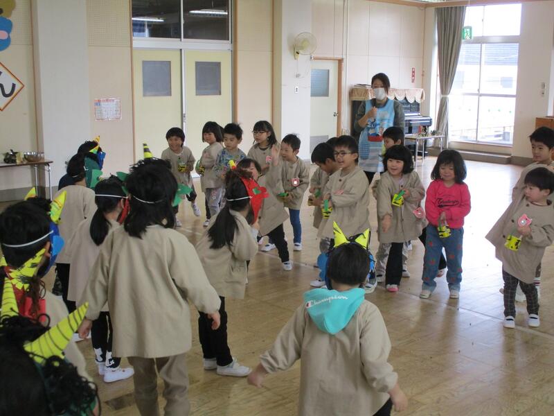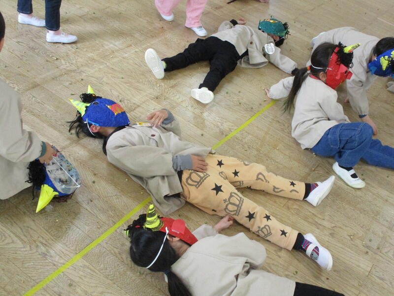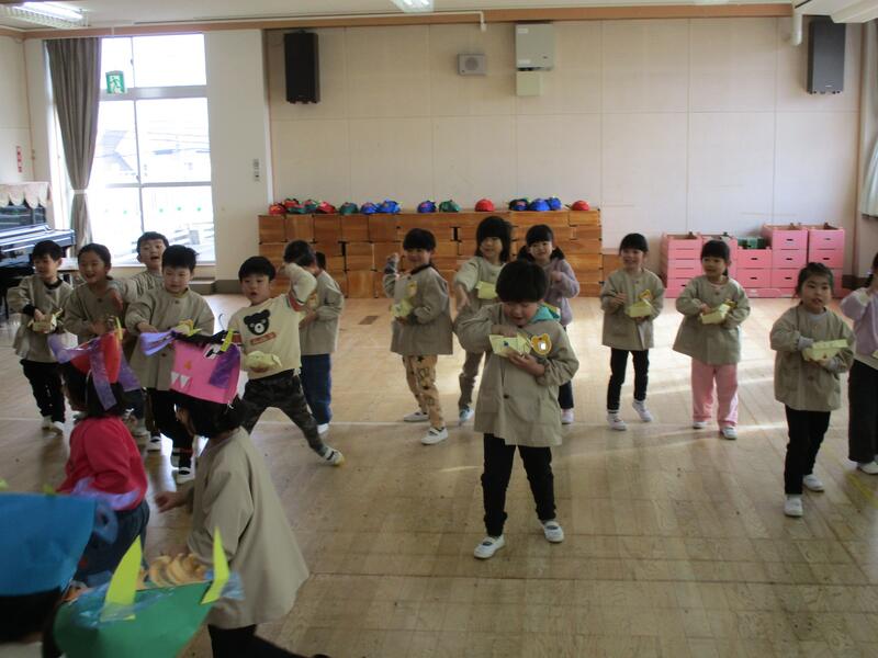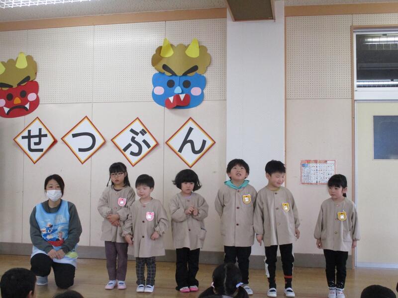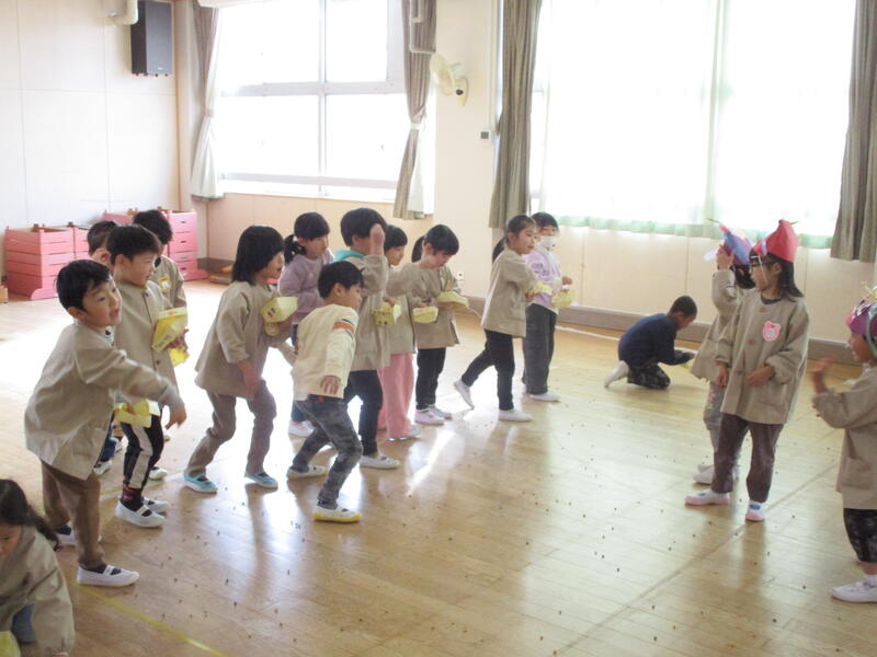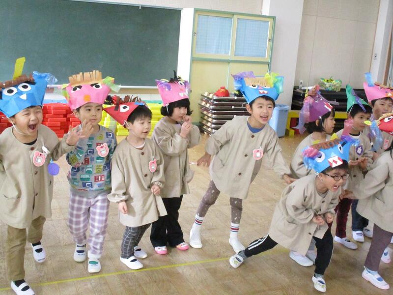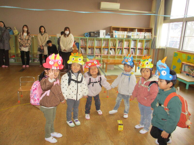 遊戯室にみんな集まって、お腹の中にいる鬼を退治する豆まき会を行いました。「泣き虫鬼」「怒りんぼ鬼」「あわてんぼう鬼」「好き嫌い鬼」「YouTube鬼」・・・。