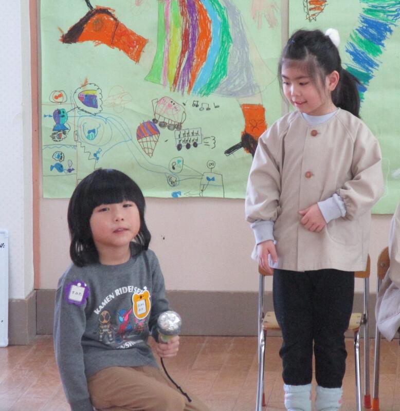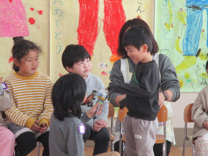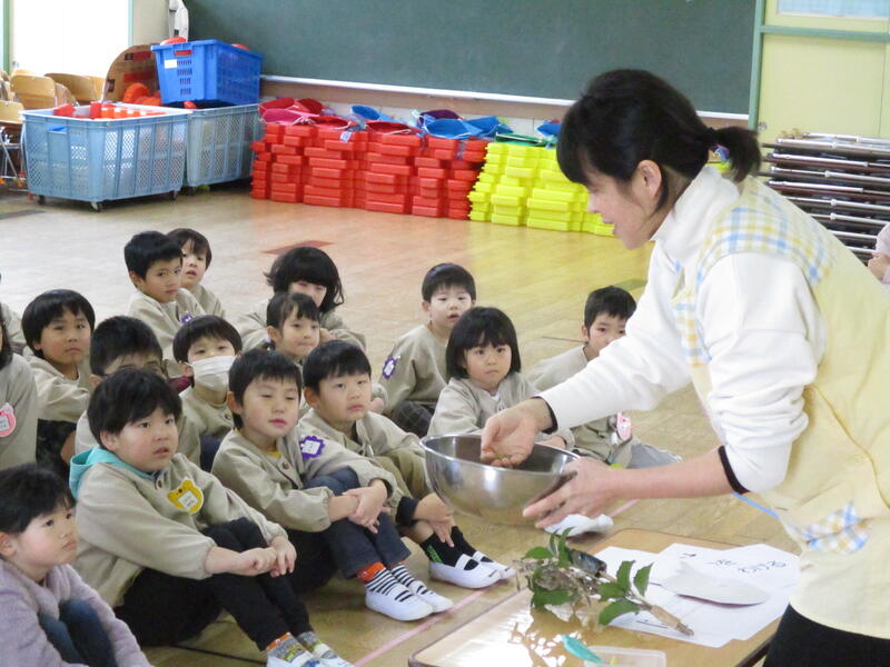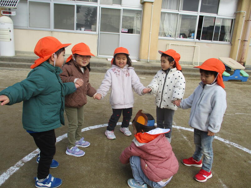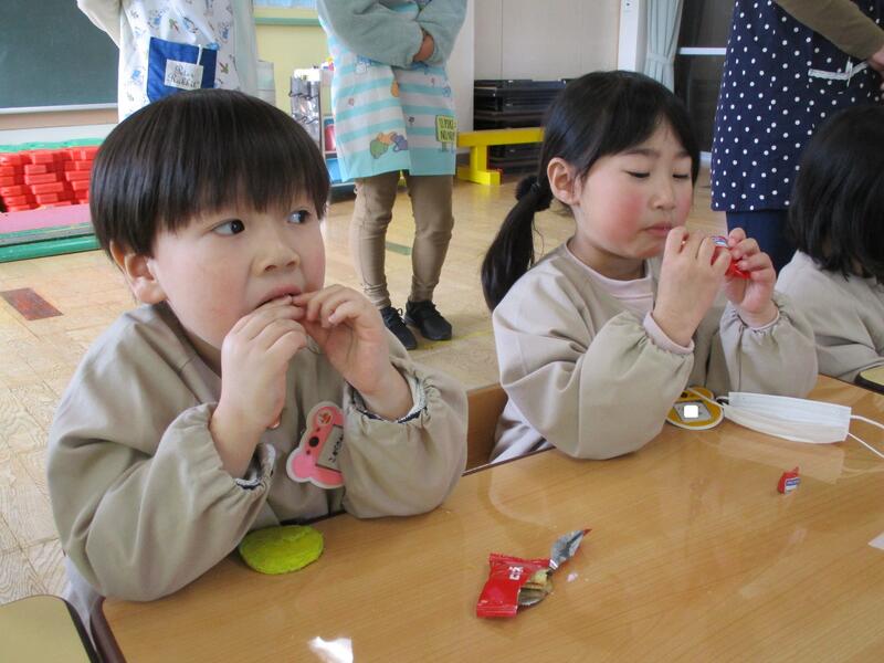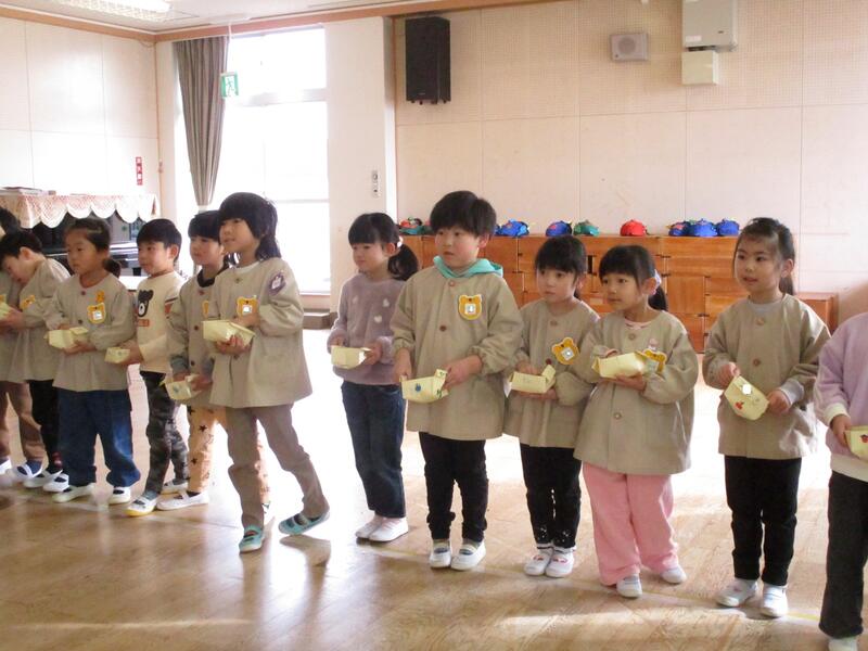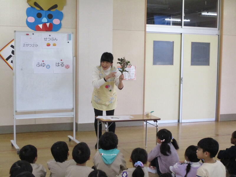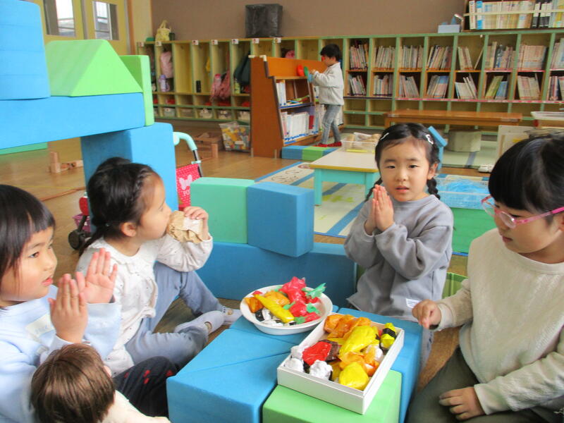 遊戯室にみんな集まって、お腹の中にいる鬼を退治する豆まき会を行いました。「泣き虫鬼」「怒りんぼ鬼」「あわてんぼう鬼」「好き嫌い鬼」「YouTube鬼」・・・。