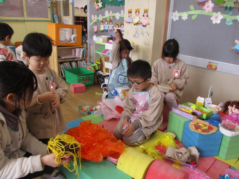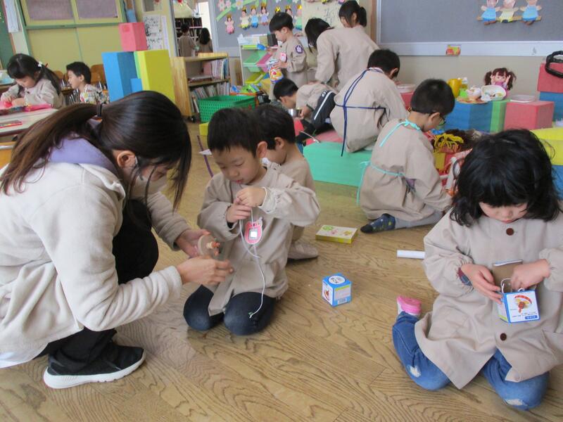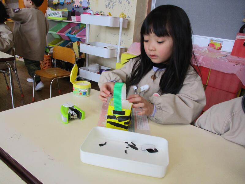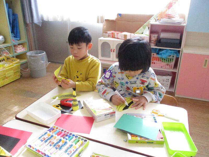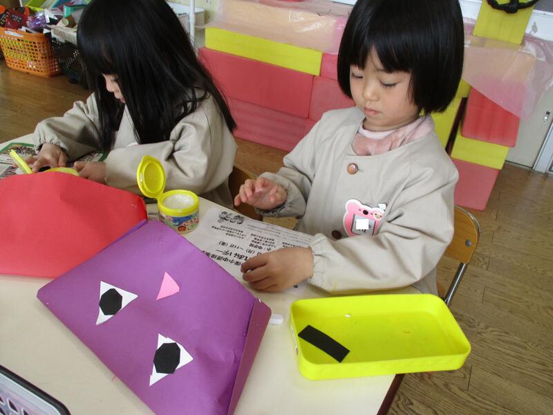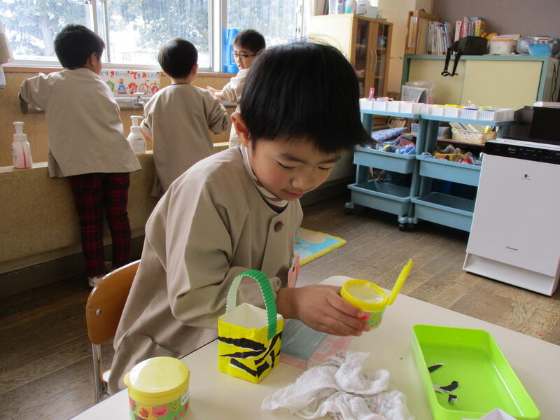 ちゅうりっぷ組の子どもたちは、鬼のパンツ模様の豆まきの箱を作りました。あっという間に仕上げていました。