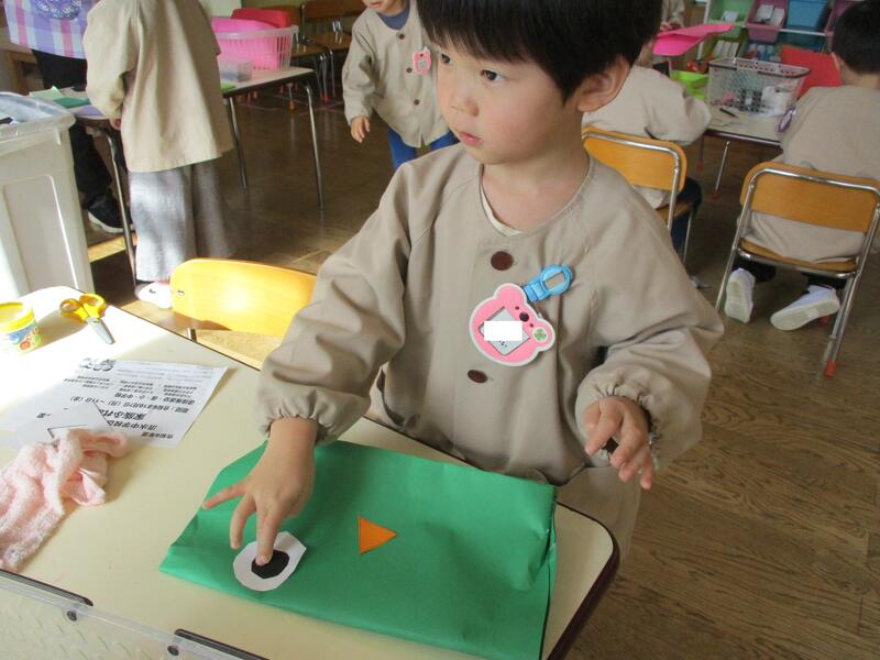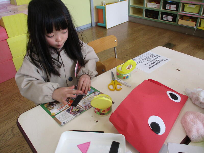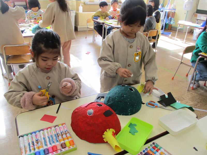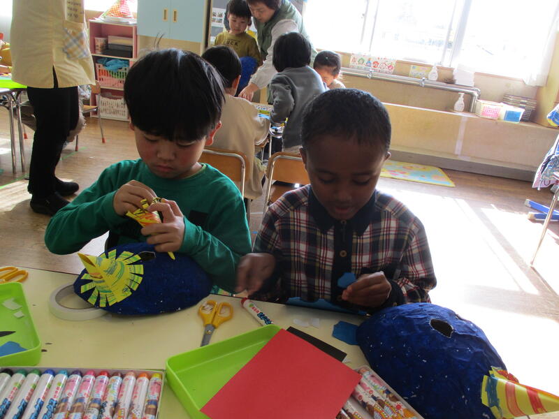 ちゅうりっぷ組の子どもたちも鬼のお面づくりにチャレンジしました。かわいい鬼、もうすぐ完成です。