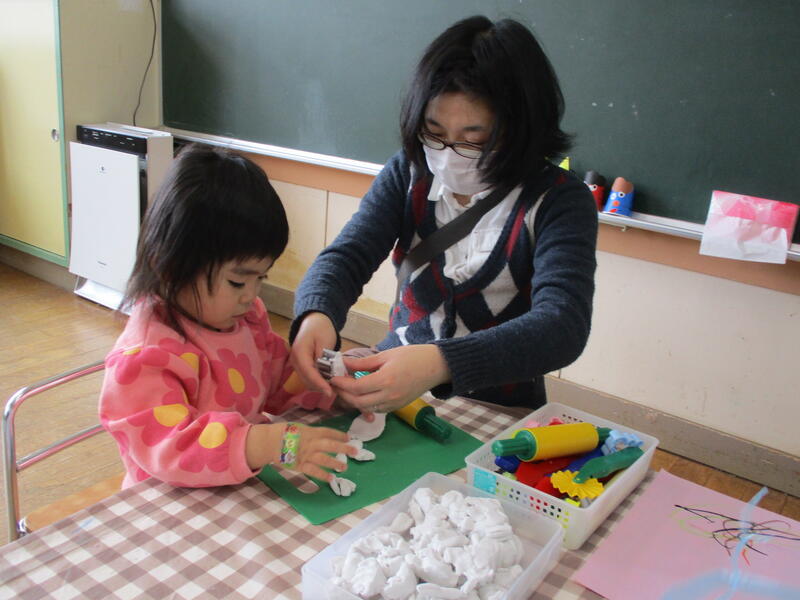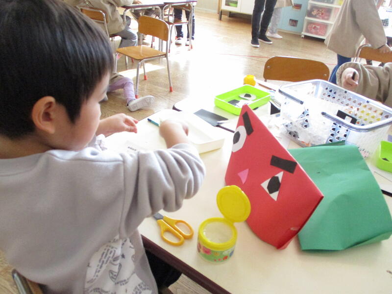 今日は、未就園児預かり保育(3歳児)の日でした。今日もみんなで仲良く遊んだり、お弁当を食べたりしました。3歳児(たんぽぽ組)も鬼のお面を作りました。