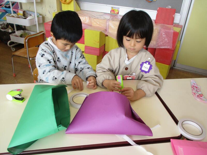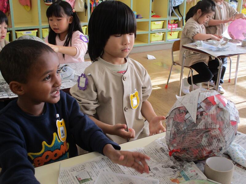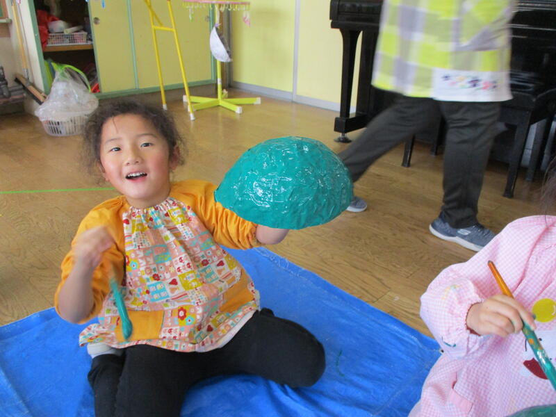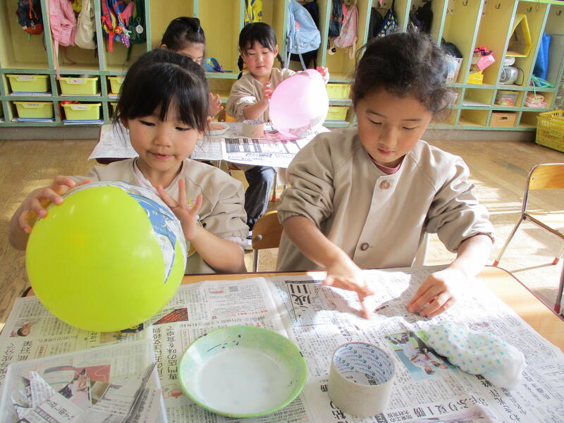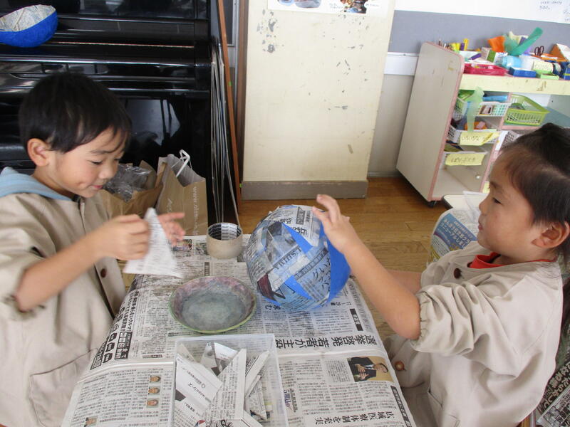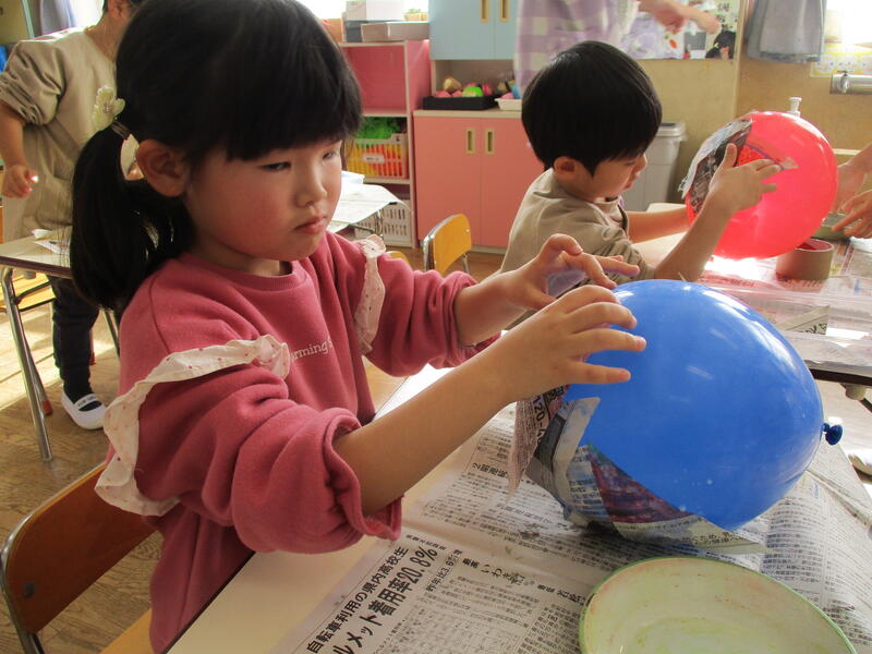 ひまわり組は、みんなで鬼のお面づくりにチャレンジしました。今日は、二人組になって風船に新聞紙を貼りました。続きは、木曜日です。