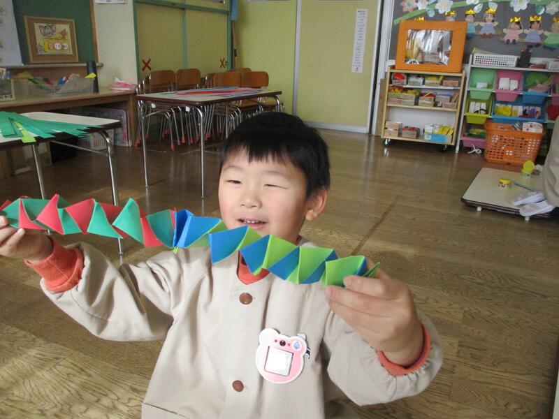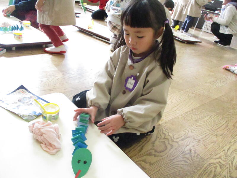 ちゅうりっぷ組さんは、みんなでへびを作りました。細長い画用紙を交互に折って作りました。先生の話をよく聞き上手に仕上げていました。
