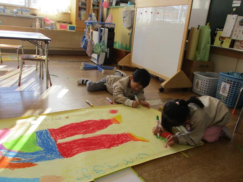 2025年1月22日 11時09分友達と協力しながら遊んでいます。ちゅうりっぷ組さんは、鬼のお面をづくりがスタートしました。どんなお面になるのかな?