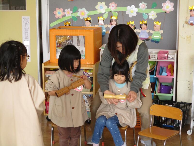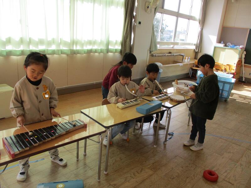 ちゅりっぷ組は、曲に合わせて楽器を鳴らして遊びました。友達とリズムを合わせて楽しんでいました。