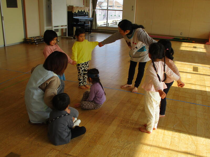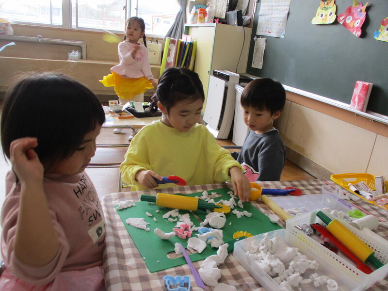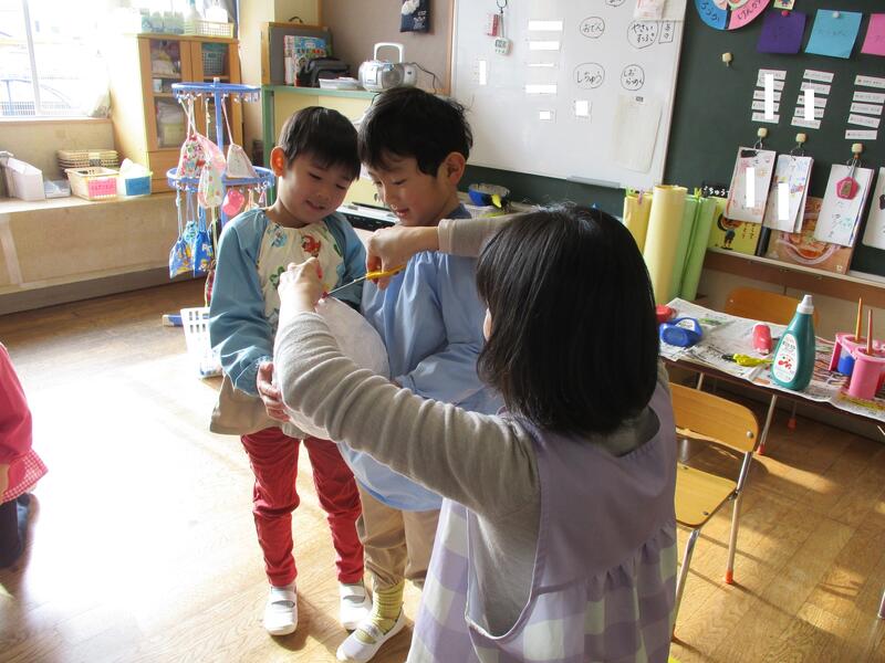 友達と協力しながら遊んでいます。ちゅうりっぷ組さんは、鬼のお面をづくりがスタートしました。どんなお面になるのかな?