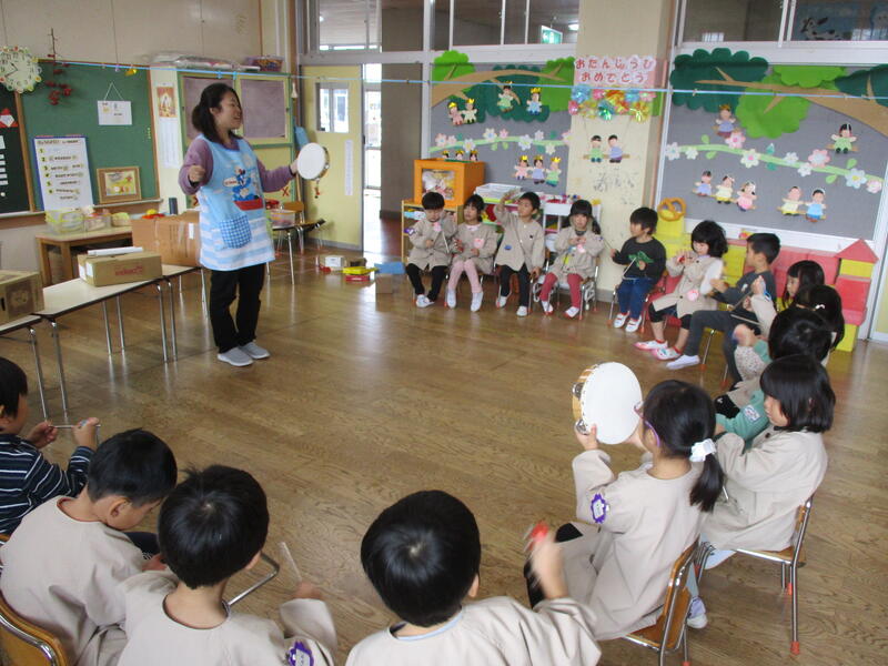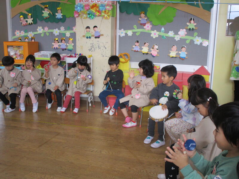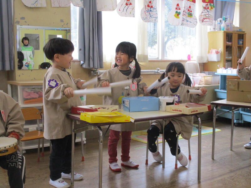 ちゅうりっぷ組の様子です。新たにトライアングルと、好きな遊びの段ボール太鼓を入れて遊びました。さんぽの曲に合わせて楽しんでいました。