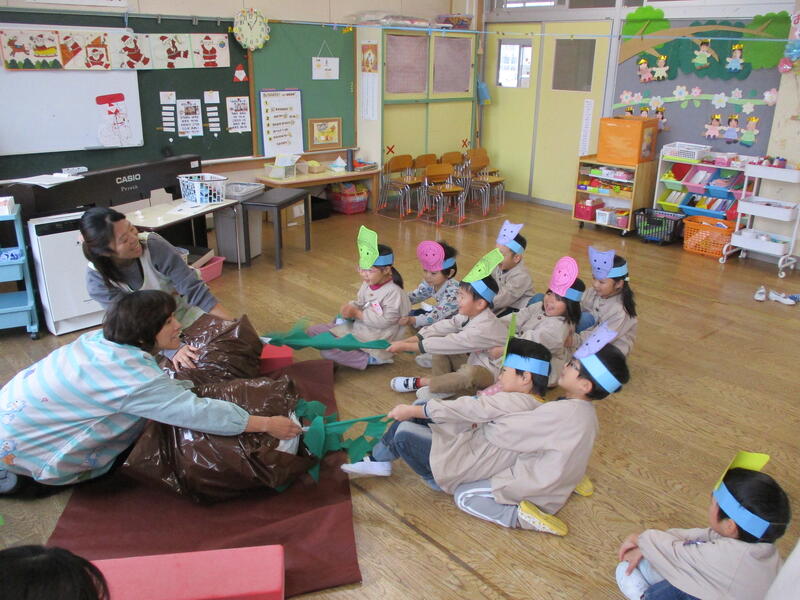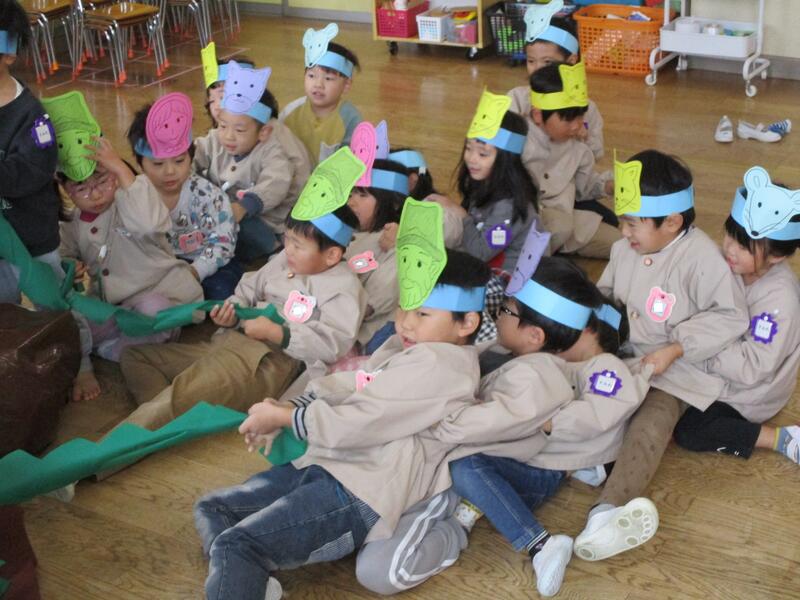絵本「おおきなかぶ」を見た後、役になりきってみんなで遊びました。