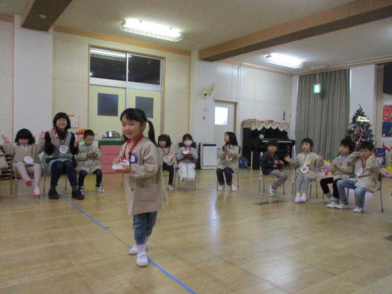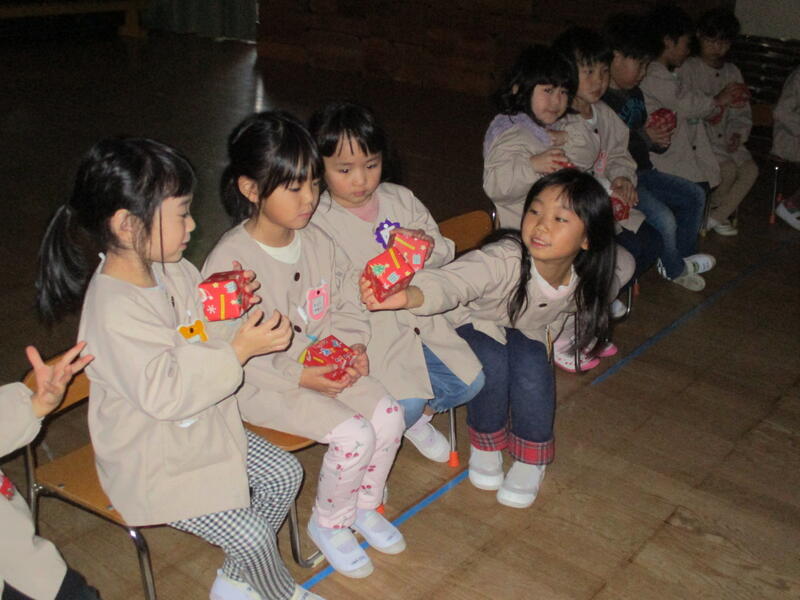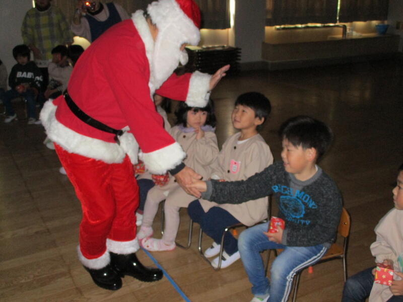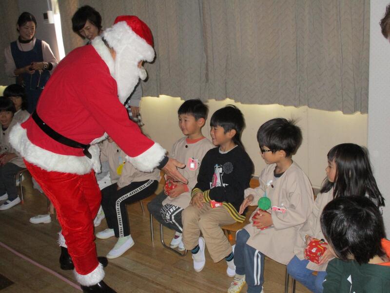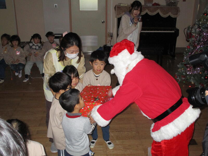 今日はお楽し会でした。クリスマスの歌を歌っていると、突然サンタさんがやってきました。子どもたちは大喜びでした。サンタさんから一人一人プレゼントをもらってとてもうれしそうでした。