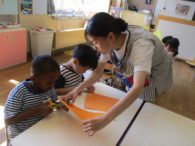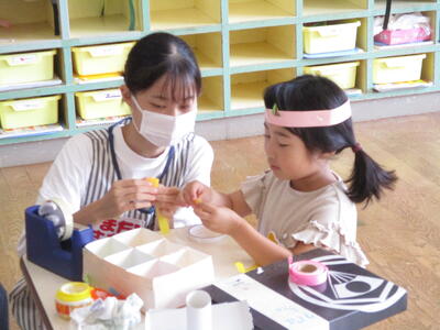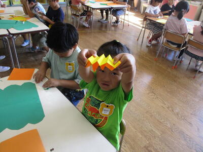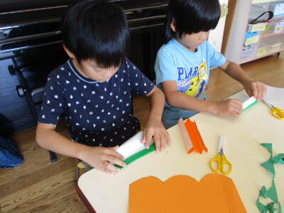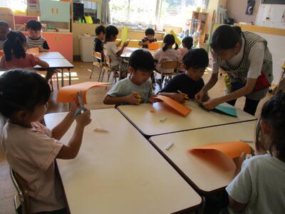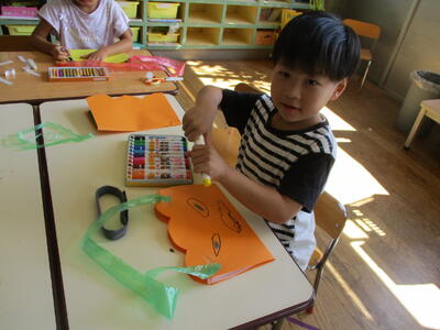 教育実習生の指導でハロウィンかぼちゃバックを作りました。話をよく聞いて作っていました。