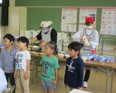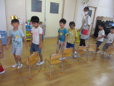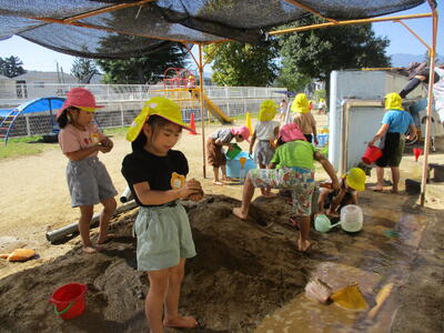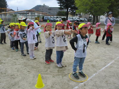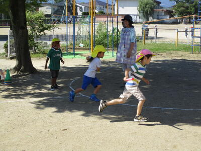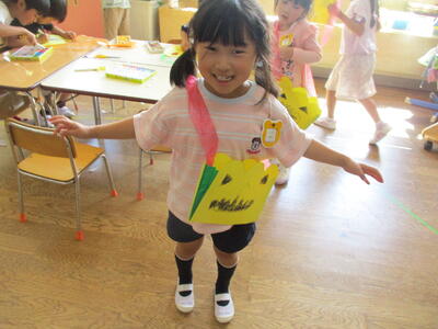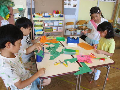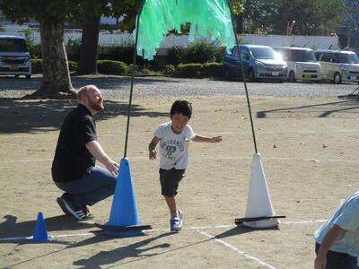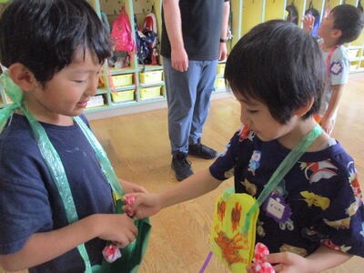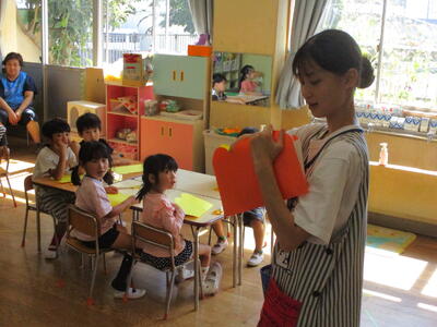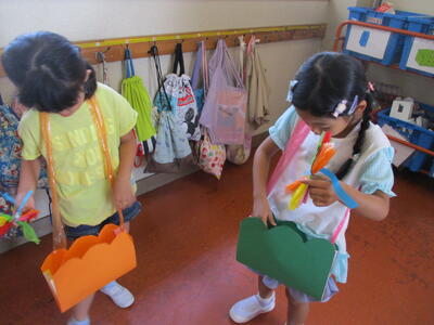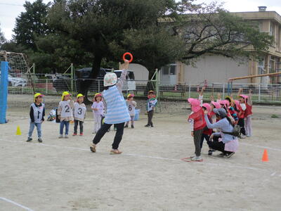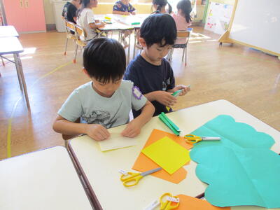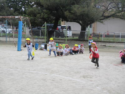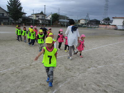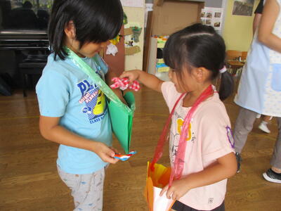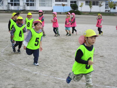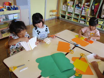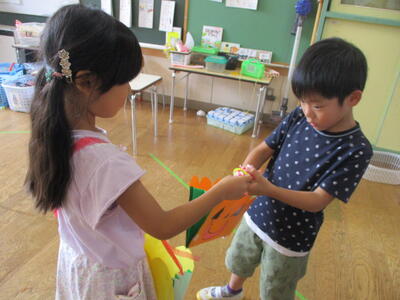 好きな遊びの時間の様子です。年少さんも年長さんも、自分たちで準備してリレーを行っていました。走ること、競い合うことを楽しんでいました。年長さんは、きのう作ったかぼちゃのバックを友達と話しながら楽しく作っていました。