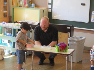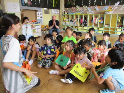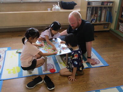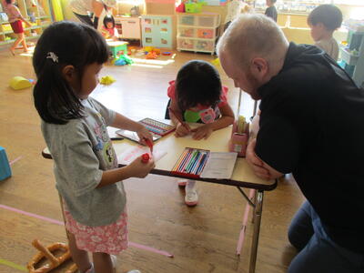 今日は、みんな大好きなALTのデイヴィット先生と遊びました。デイヴィット先生は、預かり保育の時間も子どもたちと一緒に過ごしました。デイヴィット先生は、今日だけでなく、時々預かり保育の時間に顔を出してくれます。いつも子どもに笑顔で関わっていただき感謝です。