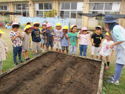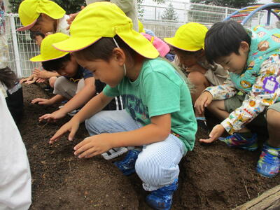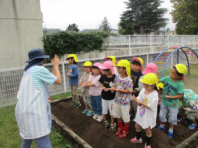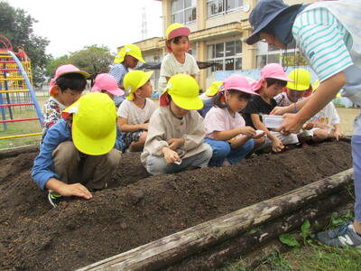 年長さんは、畑に大根の種をまきました。先生の話をよく聞いて、みんなでやさしく種をまいていました。