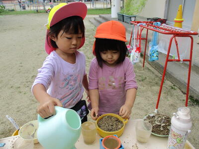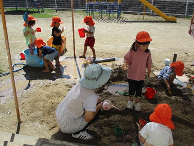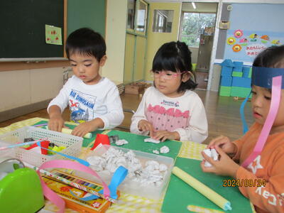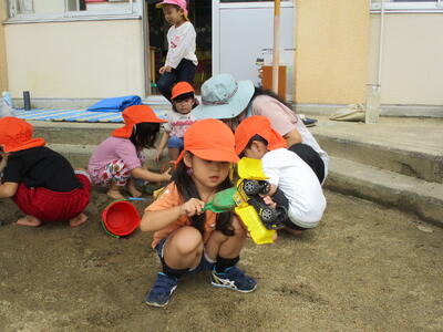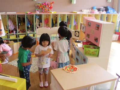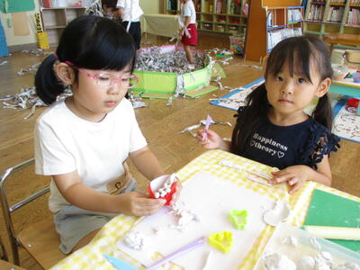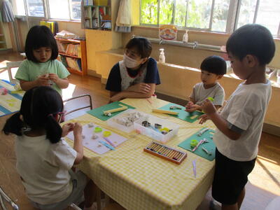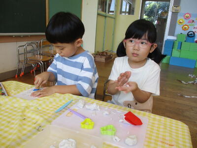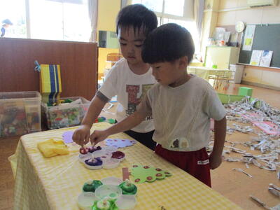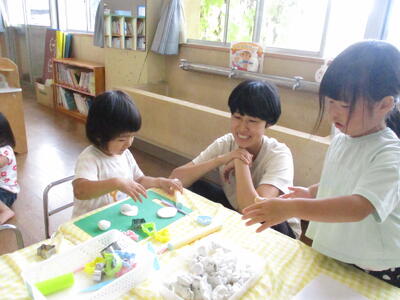 今日は、毎週火曜日に実施している「未就園児預かり保育」でした。8名全員が登園しました。友達とかかわる姿が見られるようになり、粘土や砂場で遊びました。