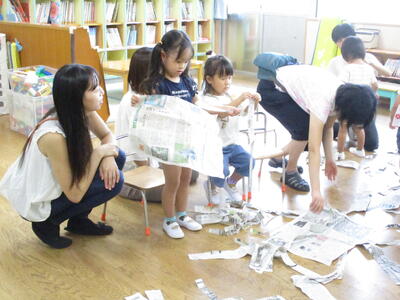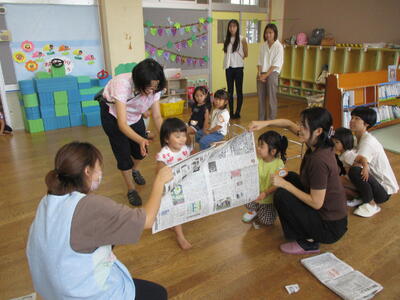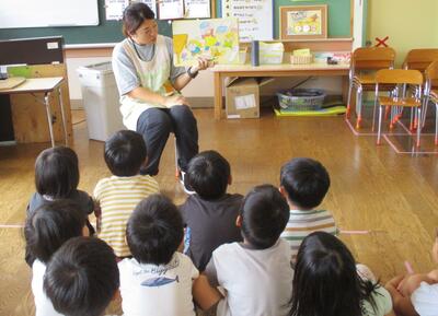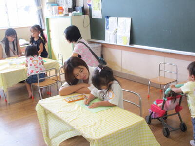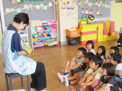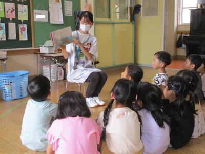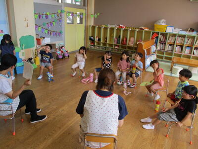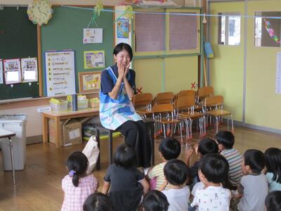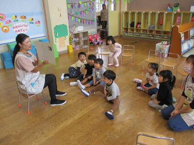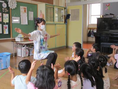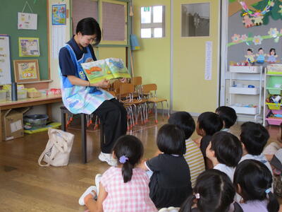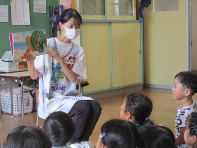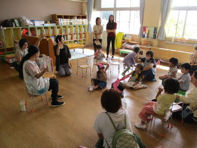 現在2名の教育実習生が教育実習を行っています。手遊びと読み聞かせの様子です。教育実習生がんばっています。