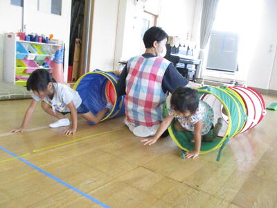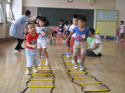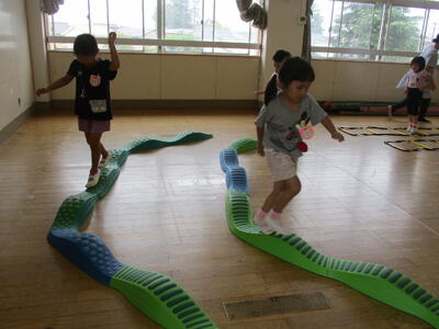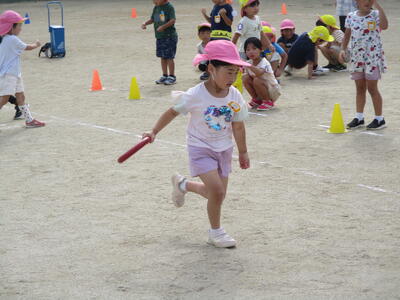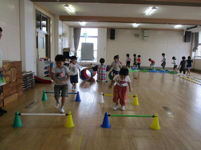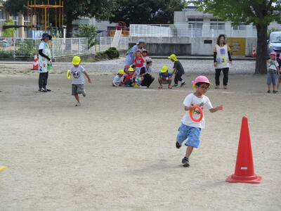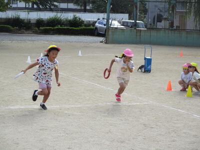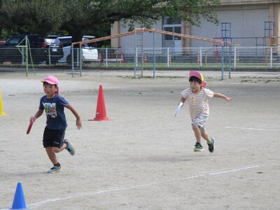 今朝も清水小学校の校庭を借りてリレーの練習をしました。走り方も上手になってきました。年少児は、競いながら、楽しくサーキット遊びをしました。