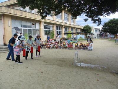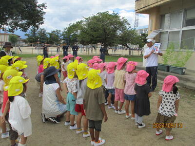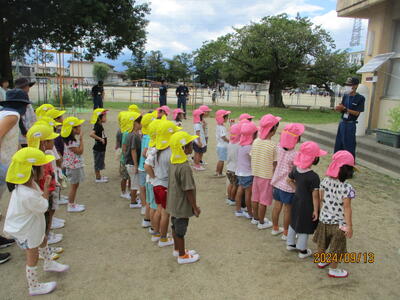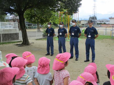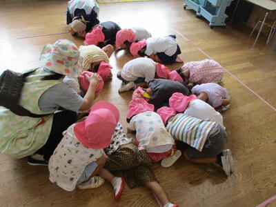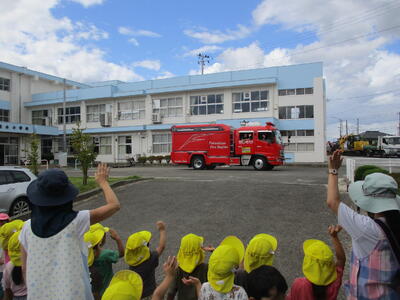 「おかしもち」の約束を守って、安全に避難することができました。福島消防署清水分署の方々に、たくさん褒めていただきました。年長さんは、予告なしの避難訓練でした。