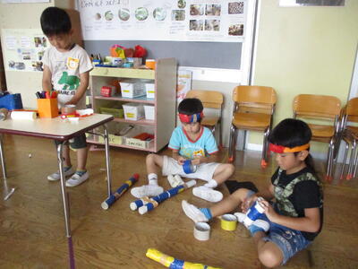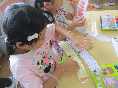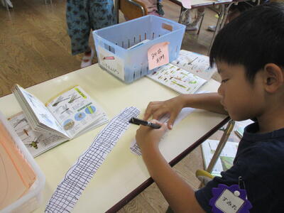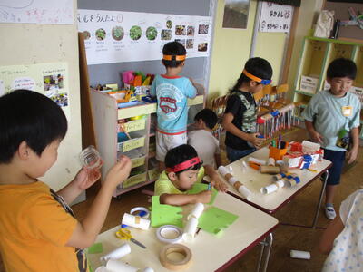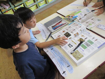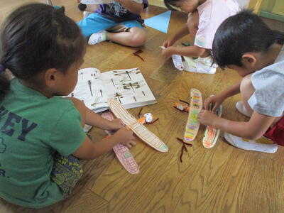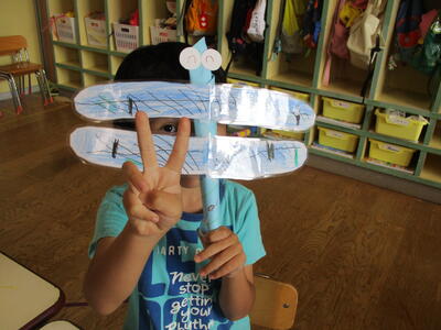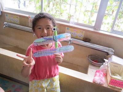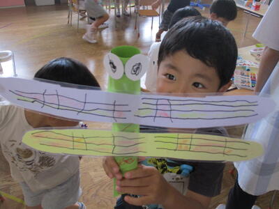 昆虫が大好きな年長児の子どもたちは、実物を見たり、図鑑で調べたりして「トンボ」を作りました。