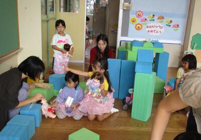 今日は毎週木曜日に実施している未就園児子育てサークル『こぐまの会』でした。年長さんと年少さんの教室にお邪魔して一緒に遊ぶ姿も見られました。
