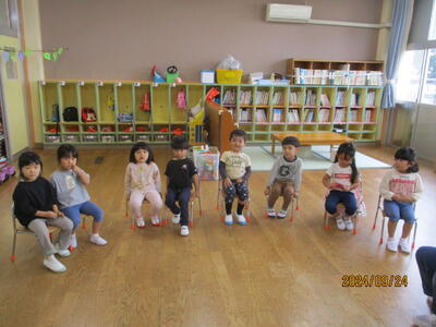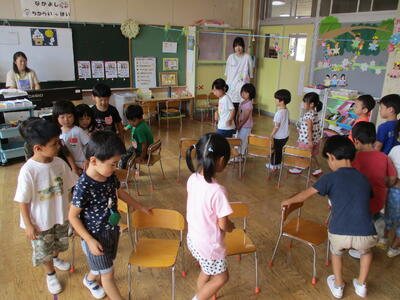 今日もみんなで楽しく遊んでいます。年少さんは、椅子取りゲームで楽しく遊びました。