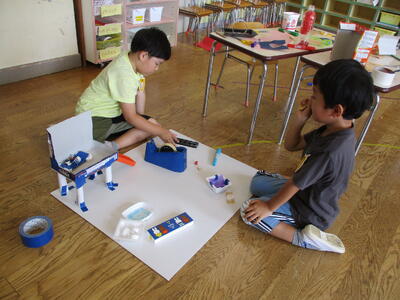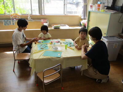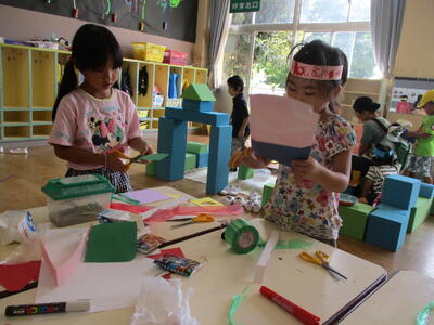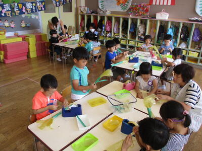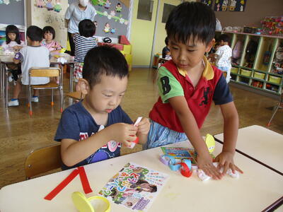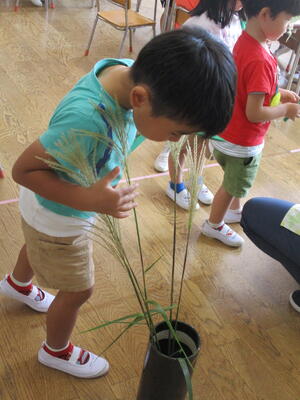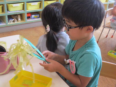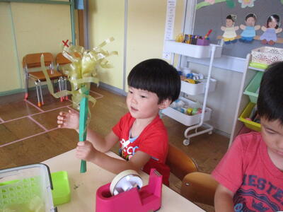 子どもたちは、スズランテープを細かく割いてススキを作りました。先生の話を聞いて、あっという間に完成です。