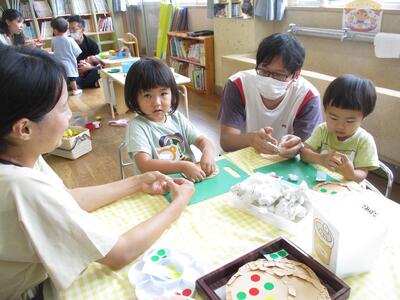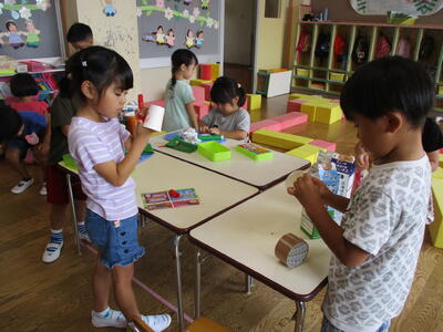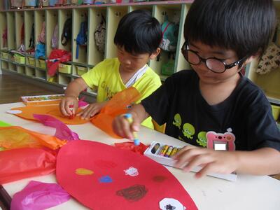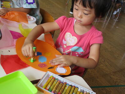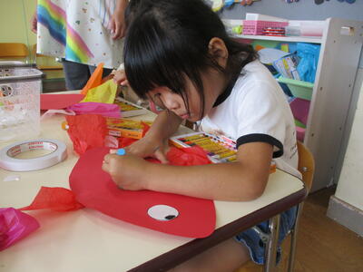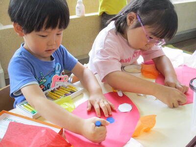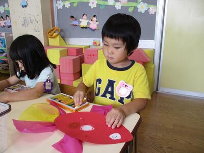 きのうの夏祭りの年長児の出店(金魚すくい)を思い出し、年少児の子どもたちは「金魚」を作りました。