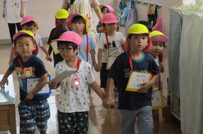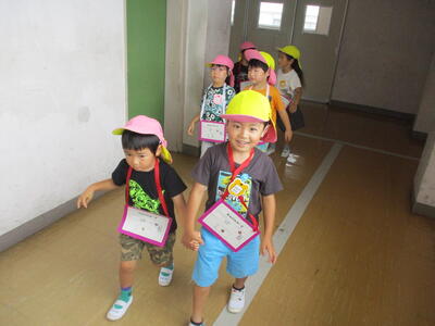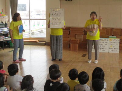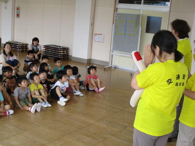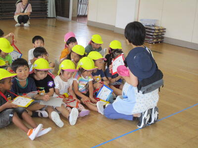 交通安全母の会の皆様をお招きして、交通安全教室を実施しました。子どもたちは、交通安全母の会の皆さんに教えていただいた、3本指の約束「わたしは かならず とまります」を守り、楽しい夏休みを過ごすことを約束しました。