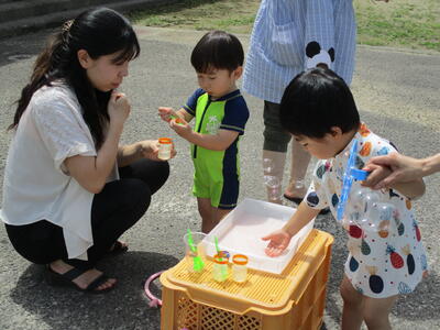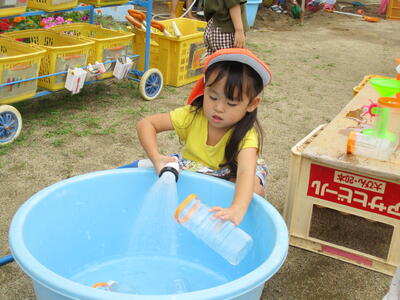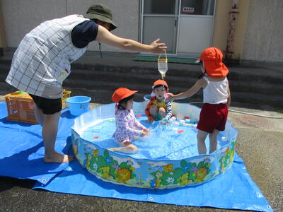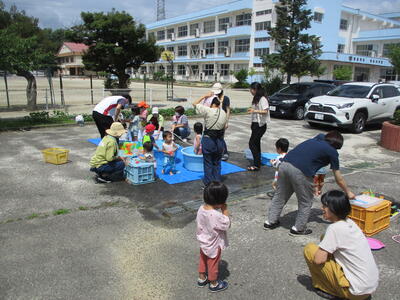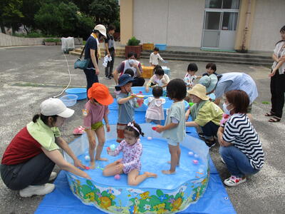 今日の「こぐまの会」は、新しいお友達が入り、とてもにぎやかでした。天気が良かったので、みんなで水遊びをしました。