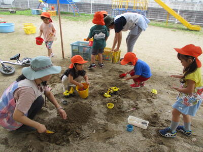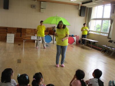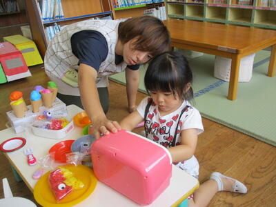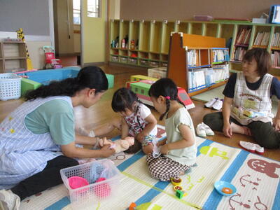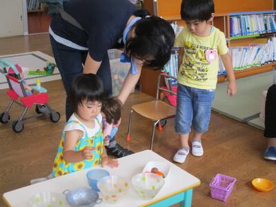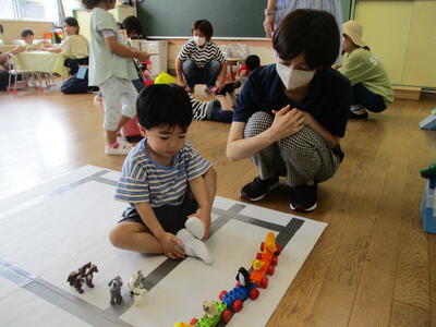 今日は、毎週火曜日に実施している未就園児預かり保育(たんぽぽ組)でした。預かり保育に来ていたお兄さんやお姉さんとも一緒に遊びました。