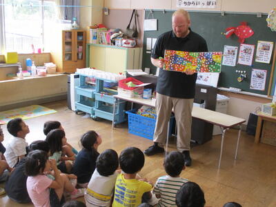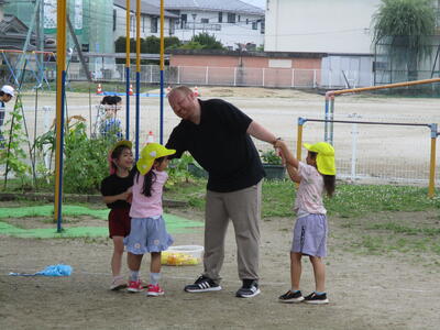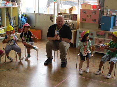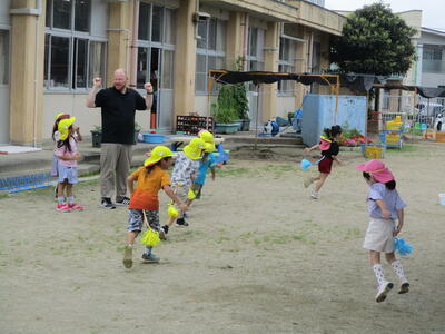 今日は、大好きなデイヴィット先生と遊びました。ドッジボールをしたり、お弁当を一緒に食べたりするなど、楽しく過ごしました。降園時には、「はらぺこあおむし」を英語で読み聞かせをしてくれました。子どもたち、大喜びでした。