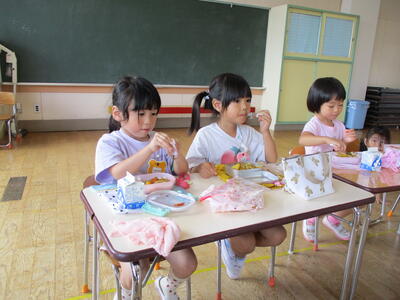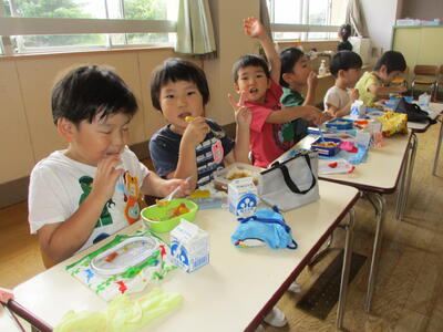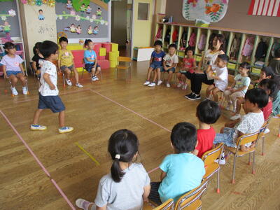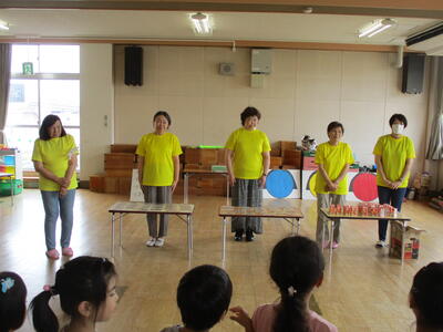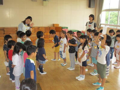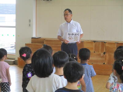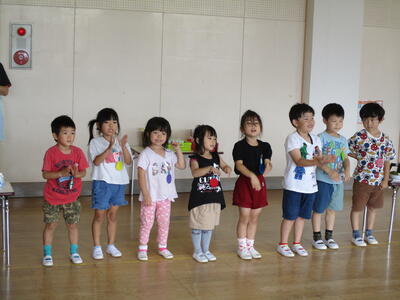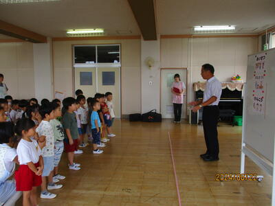第1学期終業式を遊戯室で行いました。友達の名前を呼んであいさつする人が増えたこと、みんなと仲良く、けがをしないで楽しく遊んだことなど、1学期がんばったことを話しました。また、夏休みは、いっぱいお手伝いをしたり、体を動かしたりして、楽しい夏休みを過ごしてほしいことを話しました。1学期の振り返りも、むし歯ゼロの表彰も立派にできました。最後に、「1学期ありがとう、2学期もいっしょに遊ぼうね。」のあいさつ交わしました。成長した子どもの姿がたくさん見られた終業式でした。