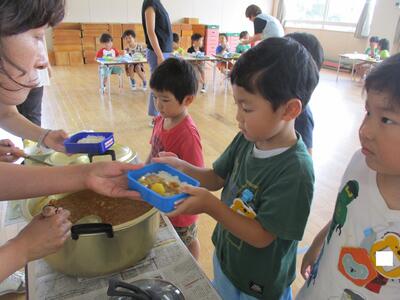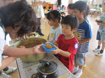今日はみんなでカレーを食べました。ひまわり組の子どもたちが収穫したじゃがいもが入ったカレーでした。なかよしペアで座り、話をしなが食べました。