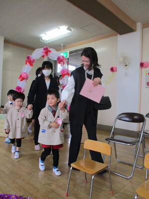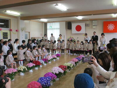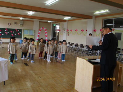 本日、元気な20名の新入園児を迎えました。年長のひまわり組の子どもたちは、元気にチューリップの歌を歌い、お兄さん、お姉さんになった喜びでいっぱいでした。明日から元気に登園して、みんなと楽しく遊びましょう。