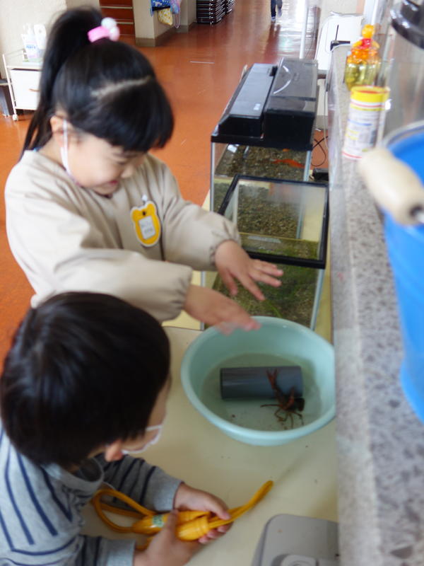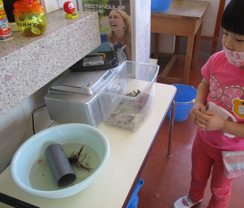 臨時休園が続いていている中、12日(火)は久しぶりの登園日なので、ザリガニがいたら子どもたちも喜ぶかなと思って、ザリガニを釣ってきて、幼稚園の玄関に置いてみました。