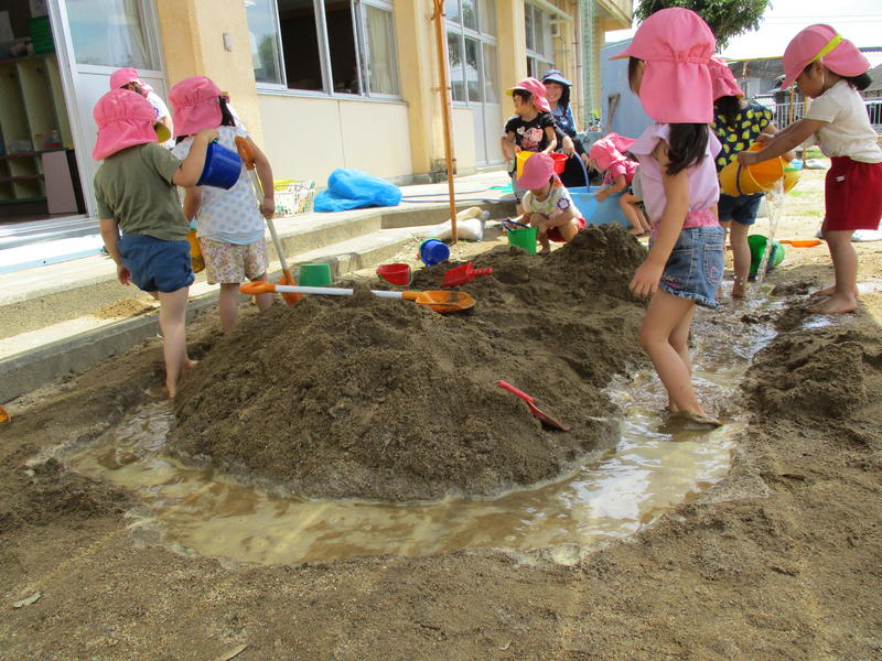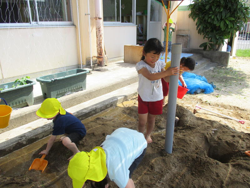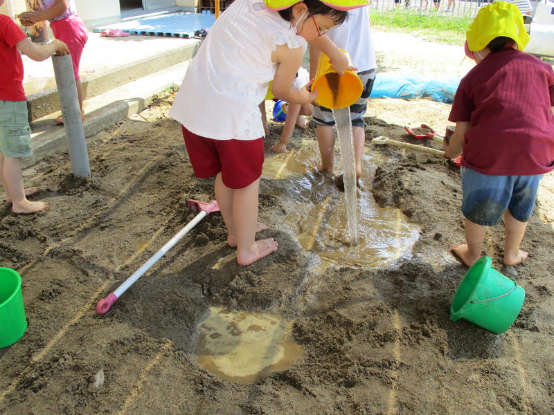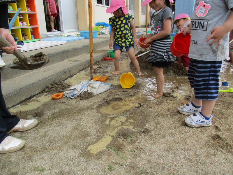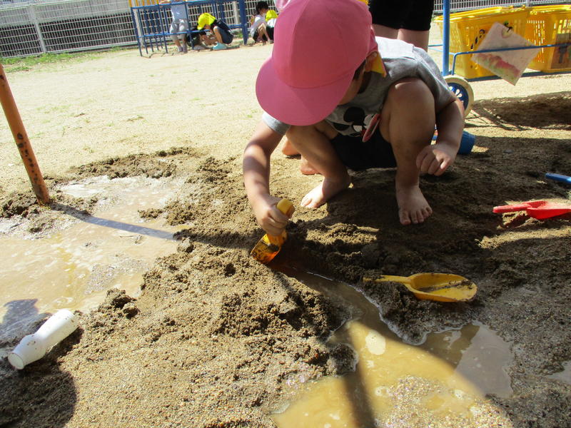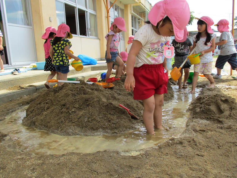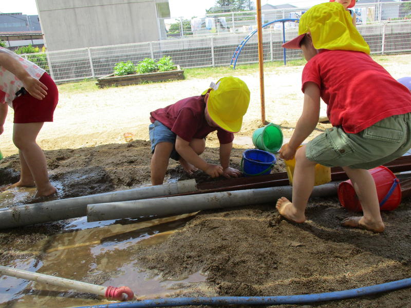 ちゅうりっぷ組(4歳児)でも砂遊びが盛り上がってきました。裸足になってヒンヤリとする水に足を入れると「キャー」と歓声を上げて大喜び。満足するまで、いつまでも川の中を歩き続ける子もいます。「こっちの方があったかい!」と、日なたと日陰の水温の差を感じ取っている子もいます。
