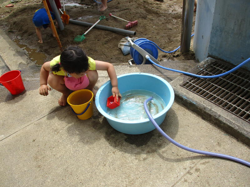 大きな池を作るために、たらいにためた水をバケツで何度も運ぶ子がいます。たらいの中の水が少なくなって、バケツでは水が汲みづらくなりました。バケツを傾けたりひっくり返したりしてどうにか水を汲もうとしますが、なかなか上手くいきません。しばらくすると、近くに小さな容器を見つけて、それで水を汲むことを思いついたようです。バケツに水がいっぱいになると笑顔でみんなのいる大きな池に戻っていきました。