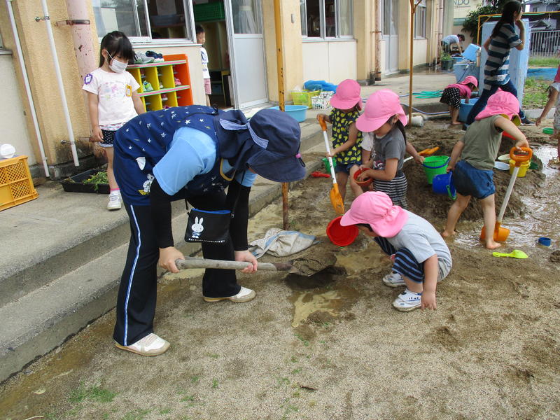 何気ない姿ですが注意深く見ると、子どもたちが自分の力で問題を解決しながら遊んでいるのがわかります。砂場ではそのような子どもたちの姿がたくさん見られるので、子どもたちも先生方も砂遊びが大好きです。