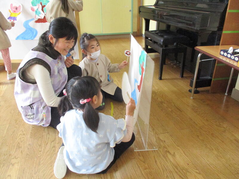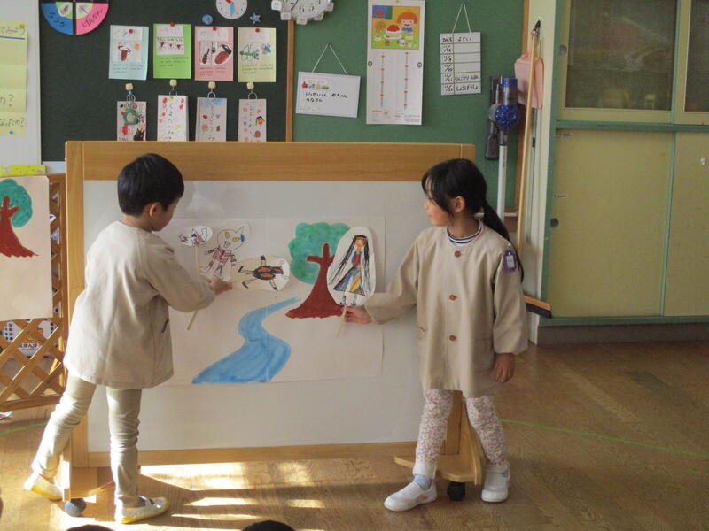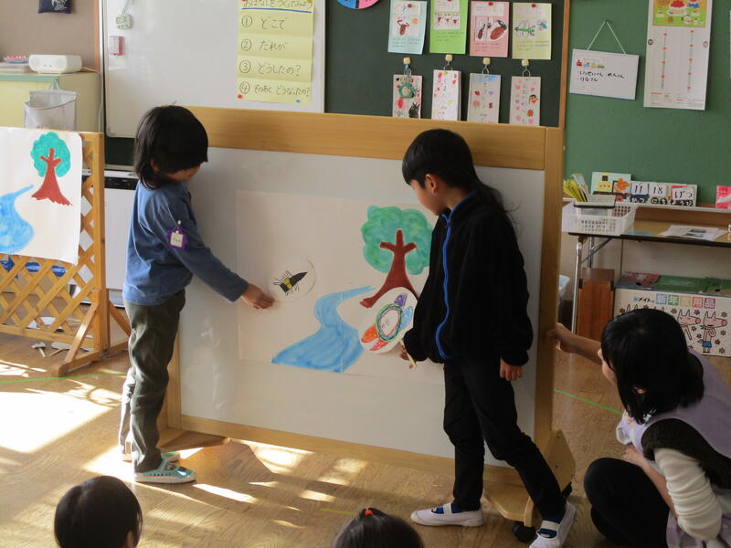 ひまわり組の子どもたちは、グループに分かれて「お話作り」にチャレンジしました。友達と一緒にお話を作ることを楽しんでいました。